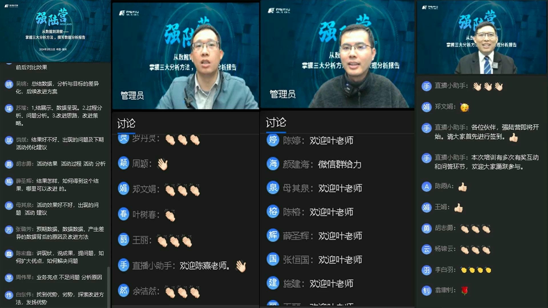 为了提升员工的数据分析能力,挖掘数据中的潜在价值,更深入地掌握数据分析技能,为业务决策提供更加精准的支持,实现数据驱动业务的目标。3月21日,集团人力资源部特别邀请新大陆大学堂内部讲师叶欣杰、陈熹,通过线上直播学习和交流互动的形式,旨在通过实战教学,让学员们快速掌握三种数据统计分析工具,并学会撰写高质量的数据分析报告。此次培训吸引了集团总部及各经营单位的研发与产品人员共计344人参与报名。培训当天,互动热烈。