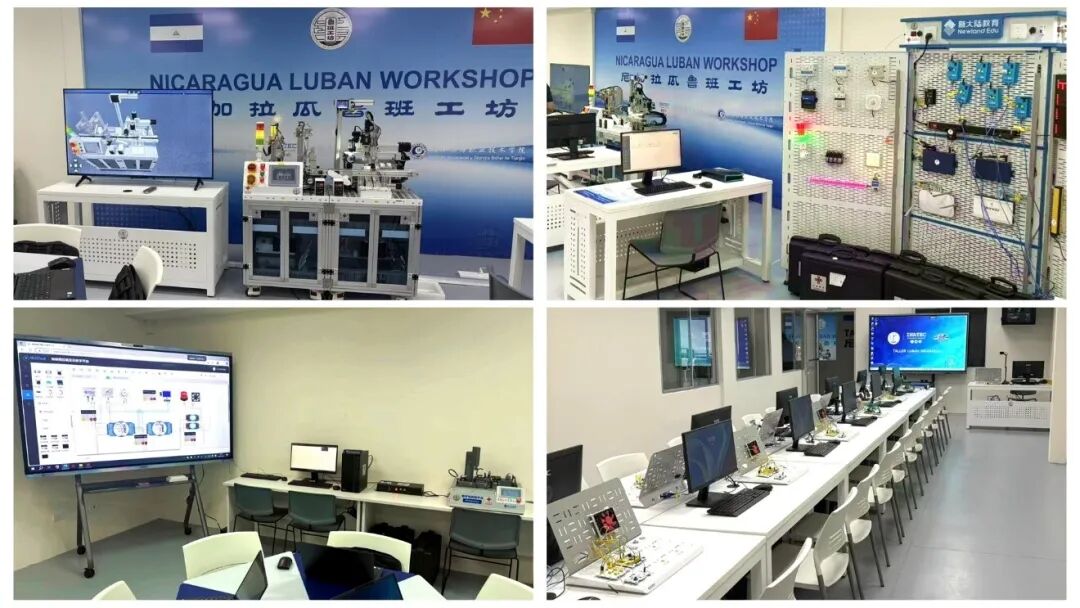 尼加拉瓜鲁班工坊由天津职业技术师范大学、天津渤海职业技术学院与尼加拉瓜国家技术培训署共同建设运营,落户首都马那瓜,共开设机电一体化技术、物联网应用技术、电气自动化技术、机械制造及自动化4个核心专业。其开创性地采用整校校园建设模式,实现教学空间、实训资源、配套设施的系统化整合,打造了职业教育国际化的“整校模式”范例,现已建成物联网技术应用实训室、物联网技术创新实训室、工业自动化实训室、智能电气装配实训室、电子产品设计实训室等10个高标准实训室,构建起完备的实训教学体系。目前,中国专家正与尼加拉瓜教师团队共同完成设备调试及课程更新,确保培训内容符合国家经济发展的实际需求。已联合开发中西双语培训手册13本、中西双语教材2本、教学动画30个、微课视频50个,为工坊开展本土化教学提供了充足的资源支撑。