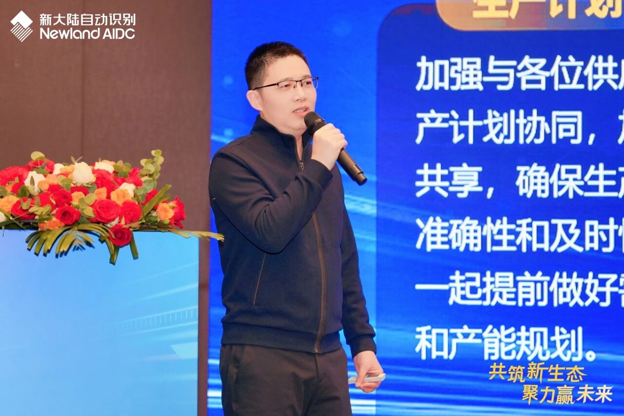 在随后的主题分享环节,研发中心丁晟与陈猛艺围绕“产品”、“技术”与“方案”,展开深度解读。从公司产品布局到2026计划方向,从核心算法突破到行业解决方案分享,他们详实的数据与鲜活的案例,展现了新大陆自动识别持续深耕AIDC行业的决心,也传递出对供应链协同创新的更高期待。销售部门谢金回顾过往合作基础,展望未来发展机遇,认为唯有强化与供应商们资源共享,实现相互赋能、才能共赢发展。
